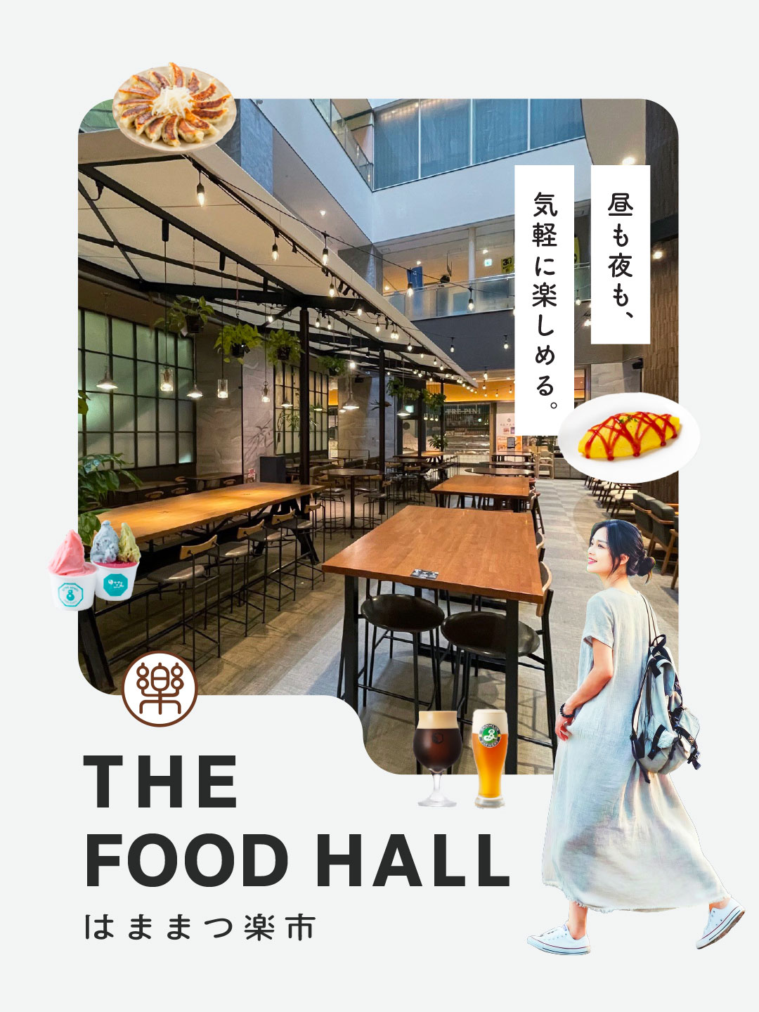 はままつ楽市は、地元浜松のおいしいものが集まったフードホールです。 ビストロ&ベーカリー、クラフトビールやワイン、 浜松餃子をはじめとするご当地グルメ、スイーツなど、 好きな料理を共有のテーブルに持ち寄って自由に楽しんでいただけます。