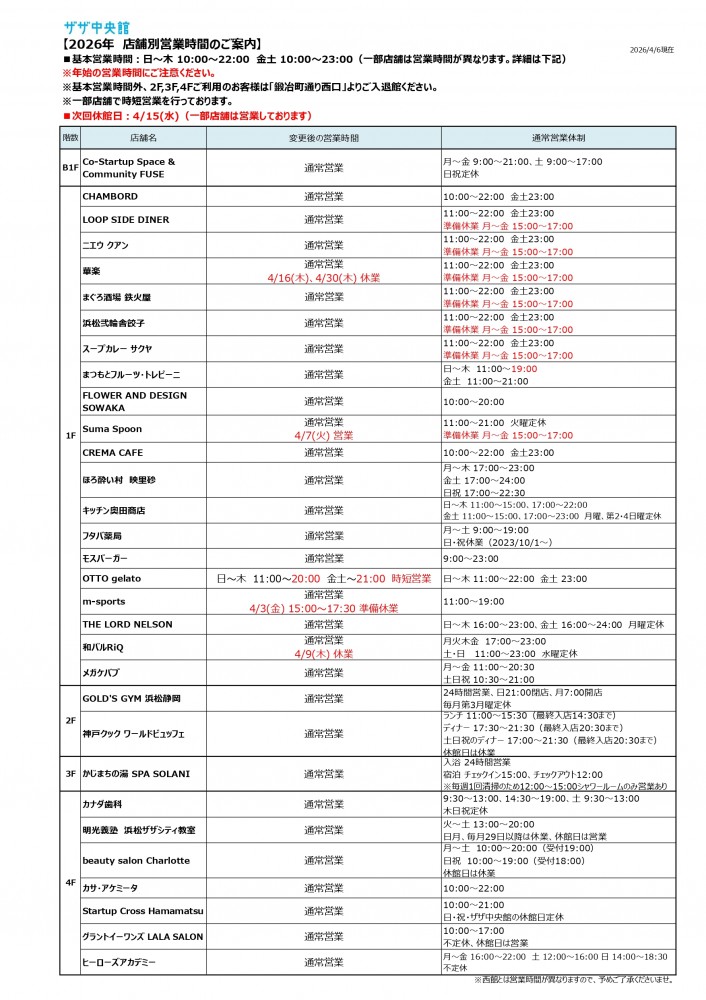 ザザ中央館は各店舗で営業時間が異なりますので、以下の表よりご確認ください。一部店舗で時短営業を行っております。