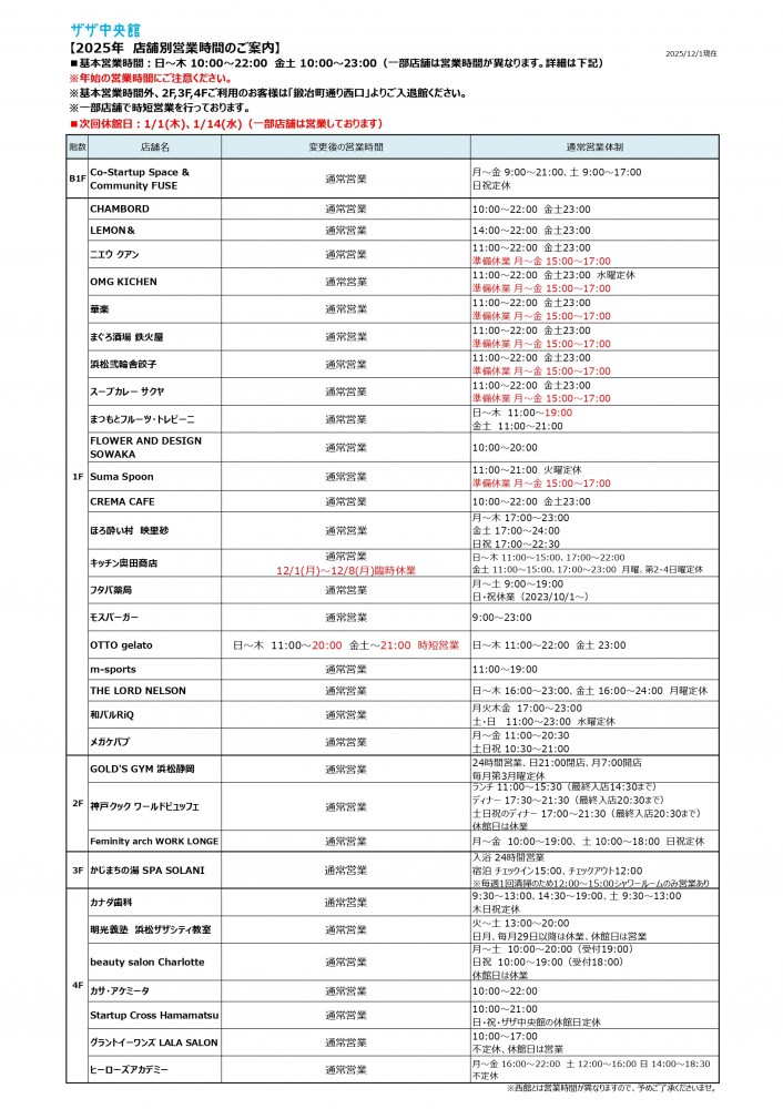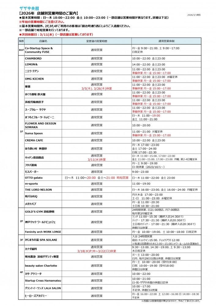 ザザ中央館は各店舗で営業時間が異なりますので、以下の表よりご確認ください。